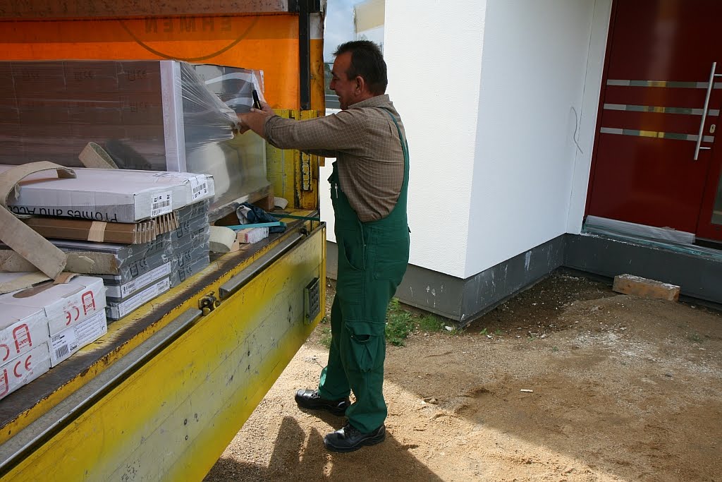 Zwei große Schritte vorwärts haben wir heute gemacht. Zunächst mal sind heute vormittag unsere Bodenbeläge auf der Baustelle eingetroffen. Laminat und Fliesen. Zuerst rollte der Atego von Steib gegen 9 Uhr an. Zu dritt luden wir unsere Lieferung recht zügig ab, dennoch rief ich Eltern an, um sie bei der Lieferung der Fliesen zur Unterstützung zu haben. Aus den Kanthälzern und OSB-Platten der Arbeitsplattform im Flur hatte ich noch eine Rampe zusammengezimmert, die für die Fliesen herhalten sollte.